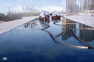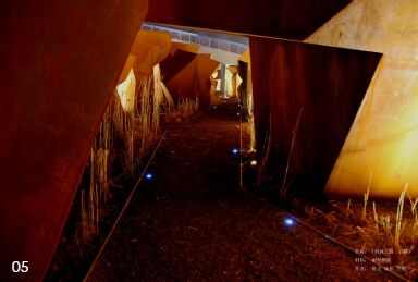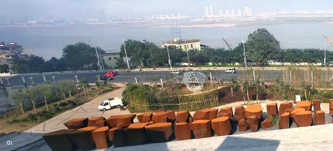 南昌紫金城《利玛窦广场》是集商业、人文、艺术、历史、宗教等因素于一身的综合性公共场所。是南昌市中江地产紫金城商业配套的开放广场,以纪念“中国第一传教士利玛窦”对中西文化交流所作 出的杰出贡献。广场整体风格凝练大气,概括简约。俯瞰广场整体主要由一个“十字架”与一组《引流引觞、递成曲水》的水池组成。“十字架”则由雕塑《荆棘之路—石阵》与斜桥组成。两组雕塑构成 二百三十米长的公共艺术景观。在接近一年的创作过程里,我们的团队在设计方案上的反复建立和颠覆、质疑与肯定贯穿过程的始终。