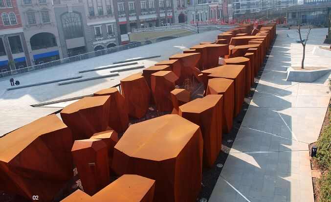 中国大规模的城市建设促进了城市雕塑的建设和发展。但我们必须清楚地知道,中国城市雕塑发展的轨迹只有短短几十年,人们缺少对城市雕塑的认识,更谈不上关注城市雕塑中蕴涵的文化和精神价值。要尽快提升人们对城雕的阅读能力,就需要艺术家在创作过程 中着重体现出作品关于人文精神的思考,使作品从缅怀历史的角度或 者是哲学性思辩的角度,提炼出作品对于围绕主题的揭示,通过作品的视觉呈现,表达出对社会现存中的人文关怀。利玛窦纪念广场表述的主人公是作为“西学东渐”的第一人和开创者,他用自己坚定的信念完美的演绎了对一个与自己完全异样文化体系的介入与改变。雕塑“荆棘之路”精确的点出了利玛窦身为开拓者的种种艰辛,而遍布在荆棘之路上的一尊尊磐石更是象征了中国几千年来政治与文化的固若金汤。但戏剧性的是,作品中所有的石头顶部和侧面都被某种外界的强大力量劈成了规则的平面,一股隐形的力量和制约感在作品中呈现出来,其代表的精神含义在物质的雕塑中被人们所感知。当人们置身嶙峋的铁阵中,神秘的造型和沙沙作响的砾石路面给观众有更多的联想空间,好奇与遐想诱导人们有了获取精神探索的动机。作为提升精神层面的要求,单纯而简练的雕塑形式更从“神性”与“人性”之间取舍出了恰到好处的人文内涵。与石阵形成鲜明对比的是水池借鉴了“曲水流觞”的构思。若粗犷、大气、棱角分明的巨石代表了西方式的 理性与宗教的神圣,水池则如一曲悠扬的江南小调,温柔而感性地回归到了纯人性的情怀当中。水中融化的“石头”写照了远道而来传播信仰的传教士利玛窦坚守信念,无私奉献的精神。利玛窦肖像以具象浮雕的形式,用简洁的碑式造型衬托,在整体抽象造型作品中放射出巨大的人格魅力和精神能量。