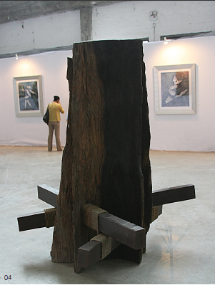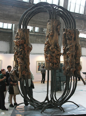 傅新民已奔花甲,但想象活力和创作精力还像年轻人一样充满朝气,大量尝试着巨型艺术创作。在他各种各样的探索中,给我印象最深的,是那些根木和金属相互嵌接或并置的雕塑和装置艺术作品。在传统根艺向当代艺术转化的历史过程中,这类作品具有特殊的意义,承担着特殊的使命。