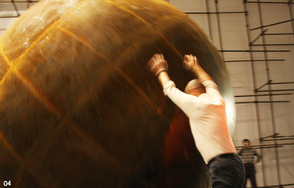 隋建国:美术馆方面在找这个灯。在讨论的过程当中,发现有一个难题就是这个灯如何跟踪这个球?要跟踪这个球就得在球上有一个热点,或者有一个什么自动化的东西让灯来对准焦距。现在看来,如果这个做不到,那么就让这个灯自己在一个范围里走,那个球也在那个范围里动,有时候会同步,有时候会不同步。那也不错,又多了一层关系。
